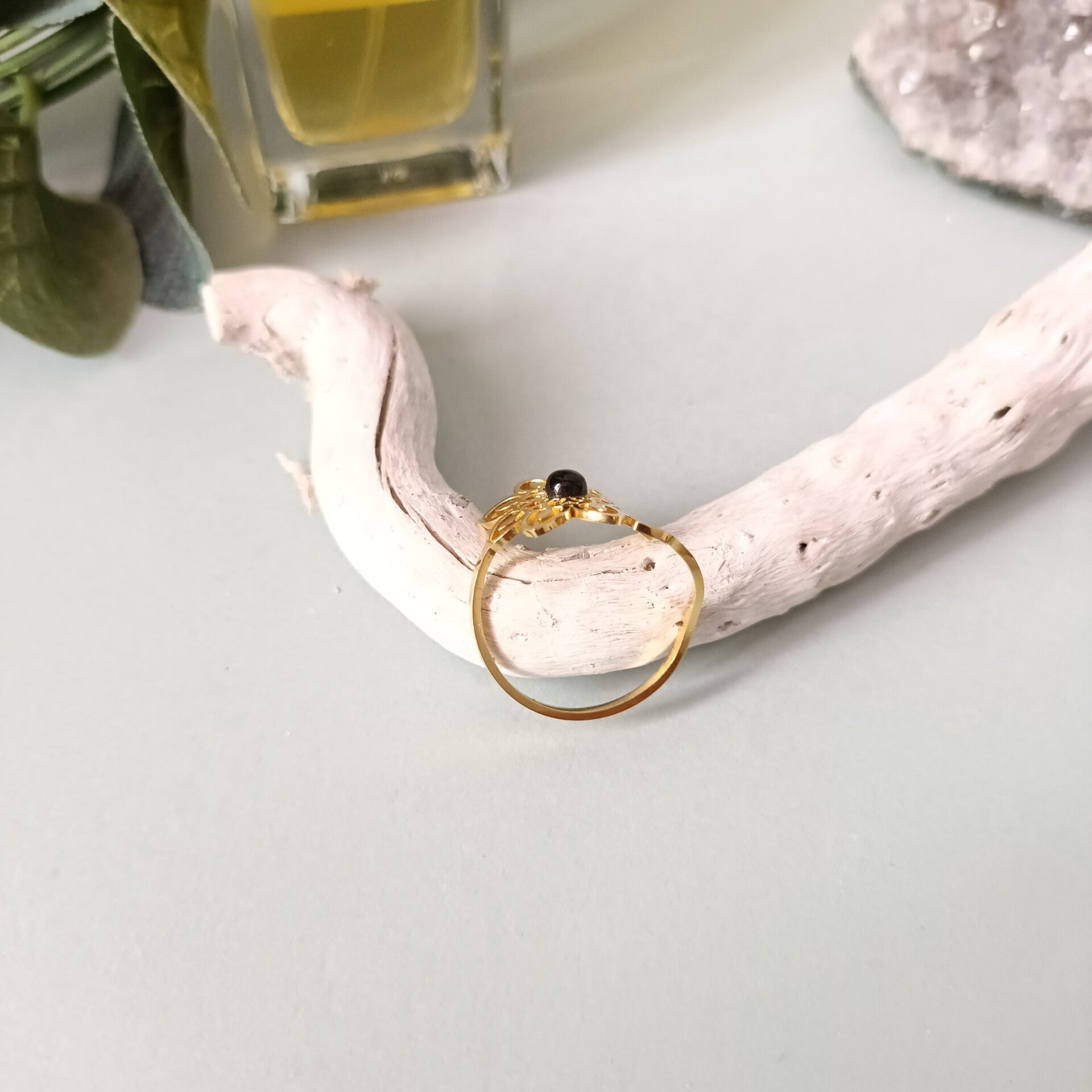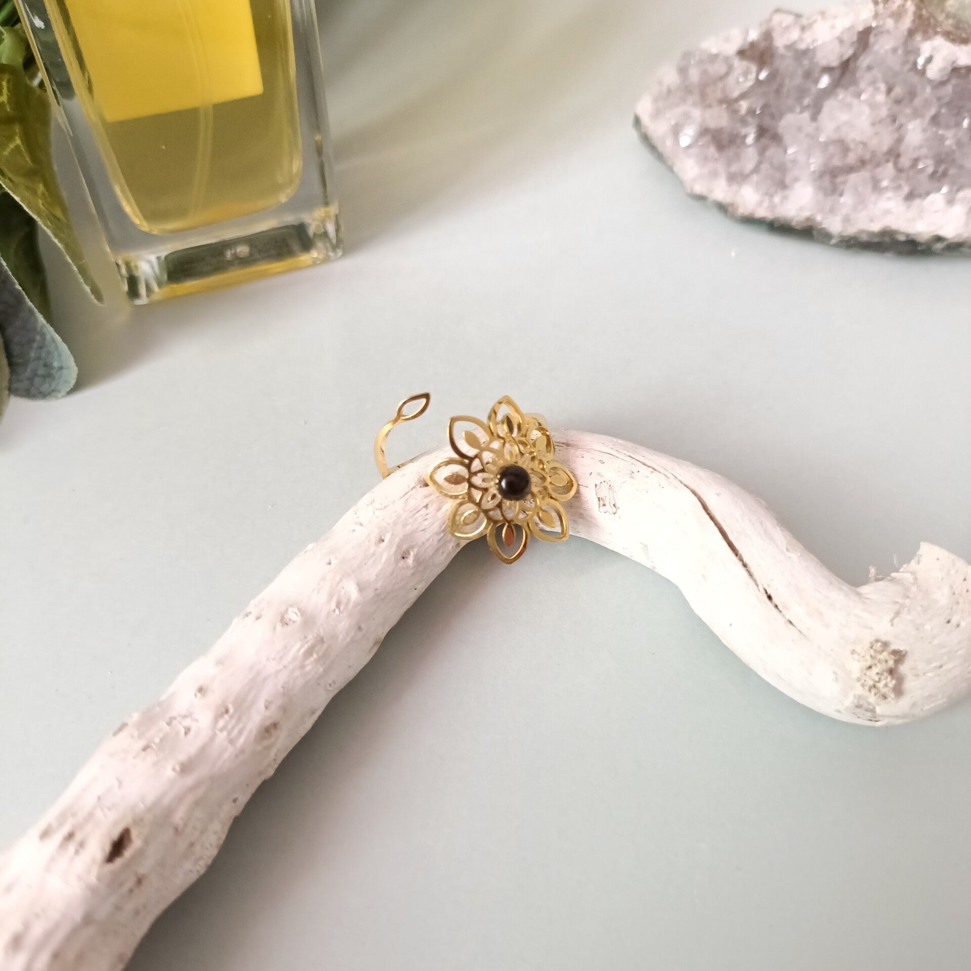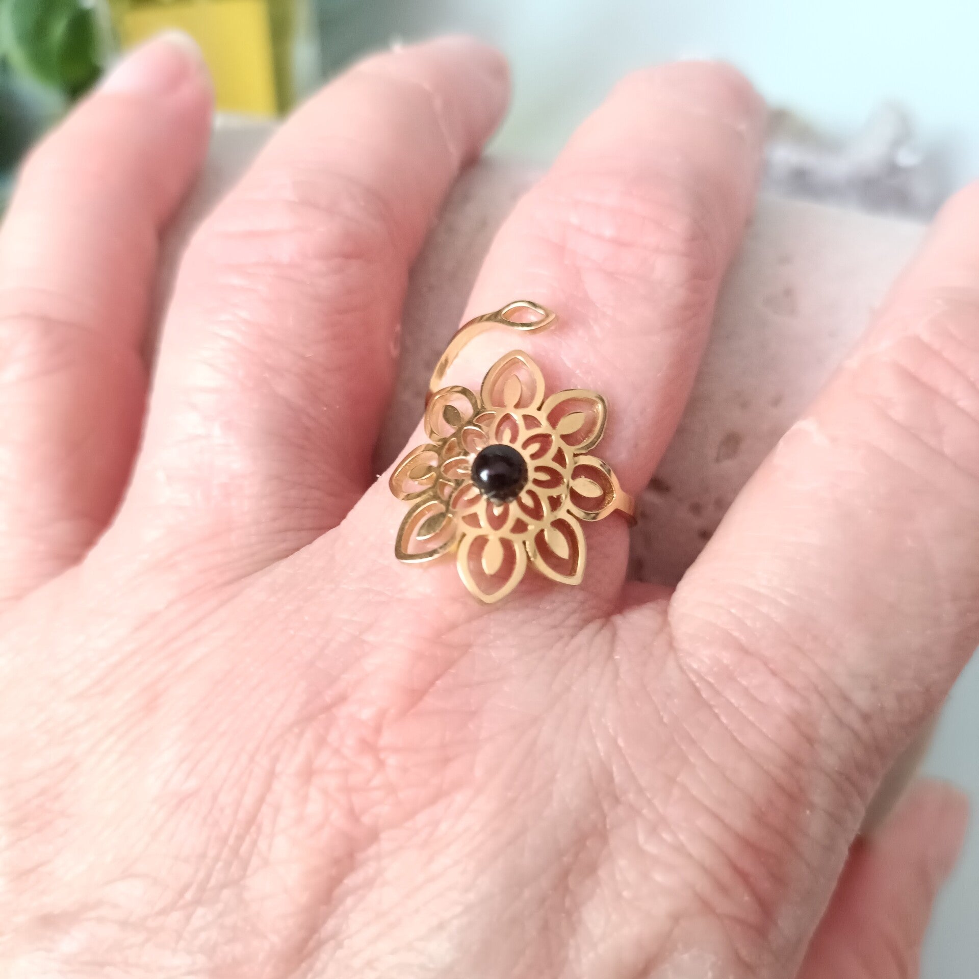 Bague Fleur de Lotus Dorée Réglable avec Obsidienne - Élégance et Protection