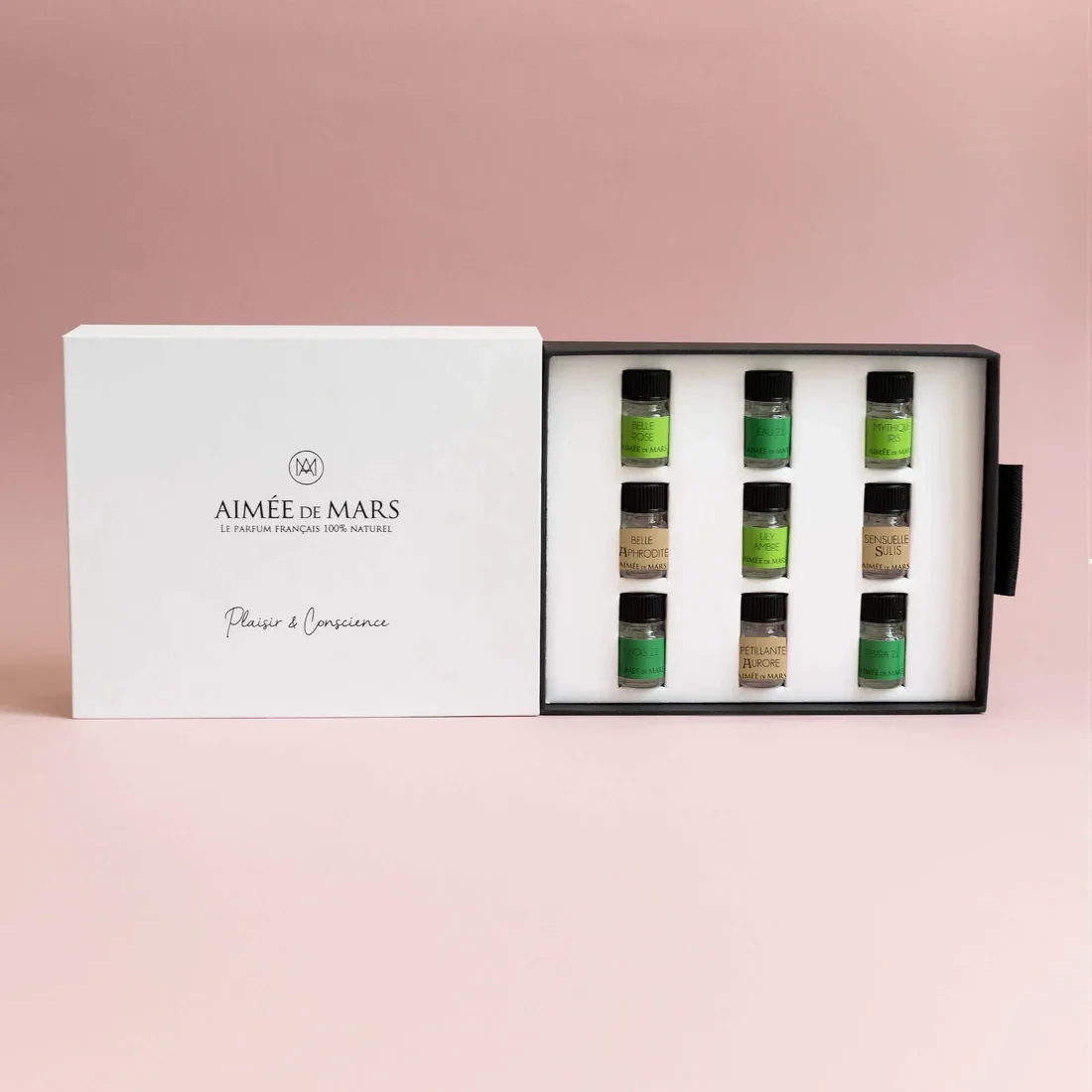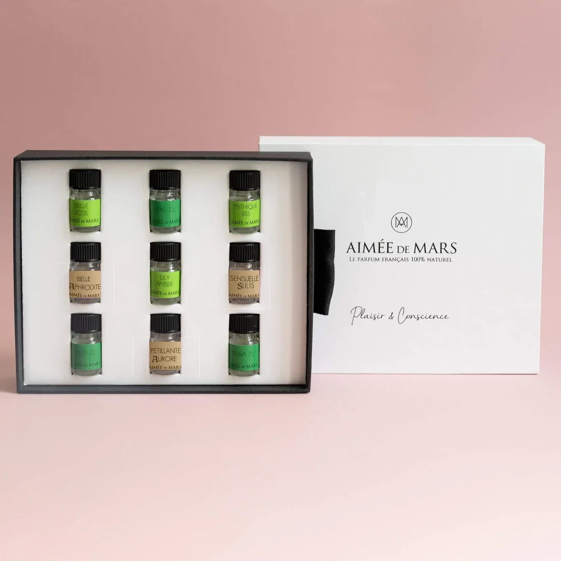 Retrouvez 9 minis flacons de parfum 100% naturel 2ml Aimée de Mars dans un coffret prêt à (s')offrir.